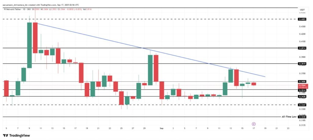 Per 17 September, Pi Coin diperdagangkan di harga $0,356, sedikit di bawah level resistensi penting di $0,360. Token ini telah berada dalam tren penurunan selama sebulan terakhir, sehingga level resistensi tersebut menjadi ujian krusial bagi kekuatan sentimen bullish.