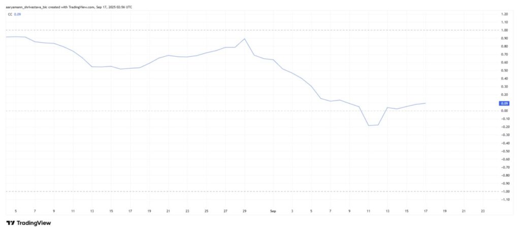 Korelasi Pi Coin dengan Bitcoin menunjukkan peningkatan signifikan, kini berada di level 0,09. Ini merupakan lonjakan yang cukup besar dibandingkan korelasi negatif yang tercatat sebelumnya, dan bisa menjadi keuntungan tersendiri bagi PI.