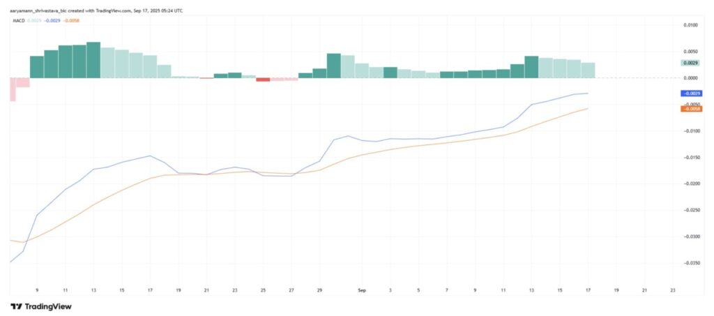 Selain itu, MACD belum menunjukkan sinyal crossover bearish yang tajam, yang menandakan adanya ketahanan dari para trader.