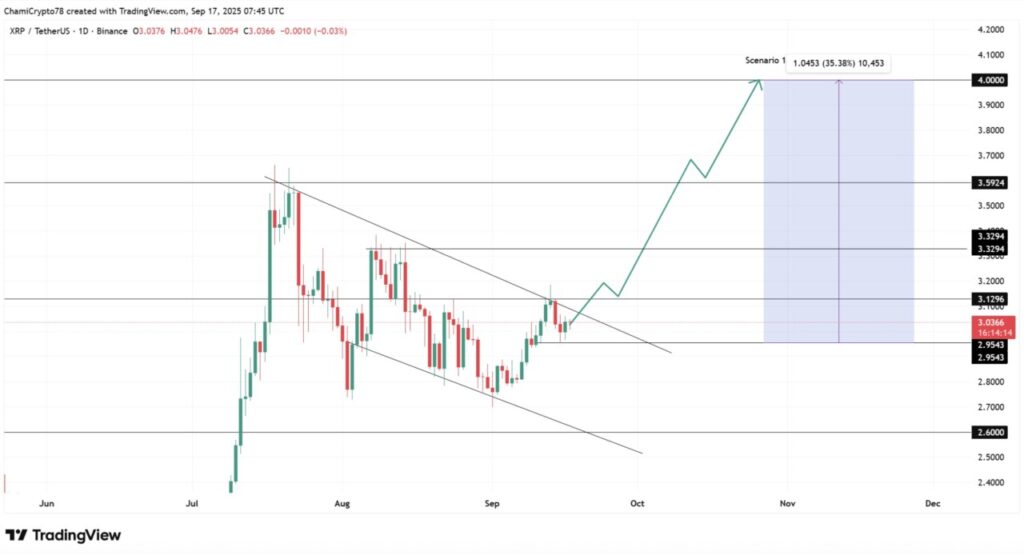 Mengutip laporan Coingape (17/9/25), pergerakan harga XRP saat ini menunjukkan upaya untuk breakout setelah berminggu-minggu berada dalam tekanan di dalam channel menurun. Saat ini, XRP diperdagangkan di level $3,03, sedikit di atas area resistensi sebelumnya yang kini berubah menjadi support di sekitar $2,95.