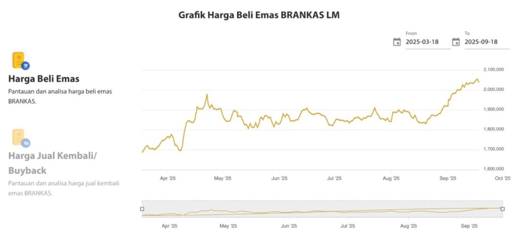 Melalui grafik harga beli emas BRANKAS LM periode 18 Maret 2025 hingga 18 September 2025, terlihat beberapa fase pergerakan penting: