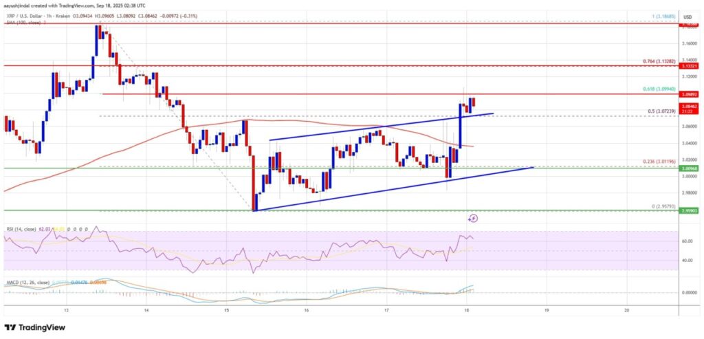 Terdapat pula penembusan di atas saluran naik dengan resistensi di $3,070 pada grafik per jam pasangan Ripple (XRP)/USD. Harga kini diperdagangkan di atas $3,080 dan rata-rata pergerakan sederhana per jam (SMA) 100 jam.