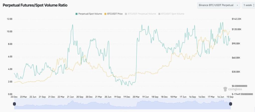 CoinGlass juga melaporkan bahwa rasio volume perdagangan antara Bitcoin Perpetual Futures dan spot trading tetap tinggi. Saat ini, volume futures tercatat 8 hingga 10 kali lebih besar dibanding volume spot.