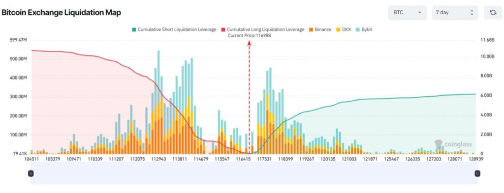 CoinGlass turut menambahkan bahwa peta likuidasi menunjukkan banyak posisi leverage tinggi berada di atas dan di bawah harga Bitcoin saat ini. Jika BTC turun ke $104.500 (sekitar Rp1,732 miliar), maka volume likuidasi posisi long bisa menembus $10 miliar (Rp165 triliun). Sebaliknya, jika BTC naik di atas $124.000 (Rp2,057 miliar), posisi short bisa rugi lebih dari $5,5 miliar (Rp91 triliun).