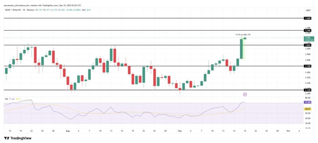 Near menjadi salah satu altcoin dengan performa terbaik pada 19 Septmber, mencatat kenaikan 13% hingga menyentuh harga $3,20. Meski momentum bullish masih terasa kuat, lonjakan harga yang begitu cepat memunculkan kekhawatiran akan potensi koreksi jangka pendek.