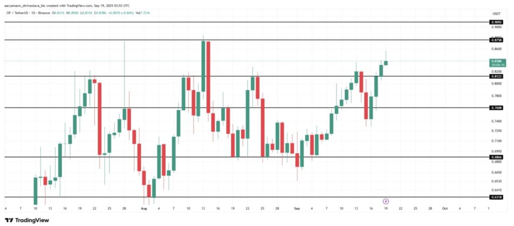 Per 19 September, OP diperdagangkan di level $0,838 dan masih bertahan di atas support $0,812 sekaligus mencatatkan level tertinggi bulanan. Namun, jika proses unlock memicu aksi jual, harga OP bisa jatuh menembus $0,812 dan melanjutkan penurunan ke area $0,760 — yang bisa mengganggu momentum pemulihan yang baru terbentuk.