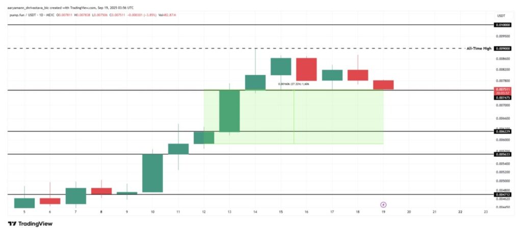 Pump.fun menjadi salah satu altcoin yang patut dipantau akhir pekan ini. Saat ini, harganya bertahan di level $0,0075, sedikit di atas support penting di $0,0074. Jika terjadi pantulan kuat dari level ini, PUMP berpotensi memulai fase pemulihan dan membangun momentum naik dalam jangka pendek.