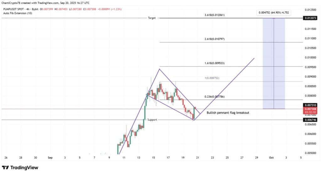 Harga PUMP saat ini bertahan di atas area support $0,0067, mengonfirmasi level tersebut sebagai fondasi kuat bagi pembeli. Grafik menunjukkan pola breakout bullish pennant, yang menandakan kelanjutan tren kenaikan masih terbuka.