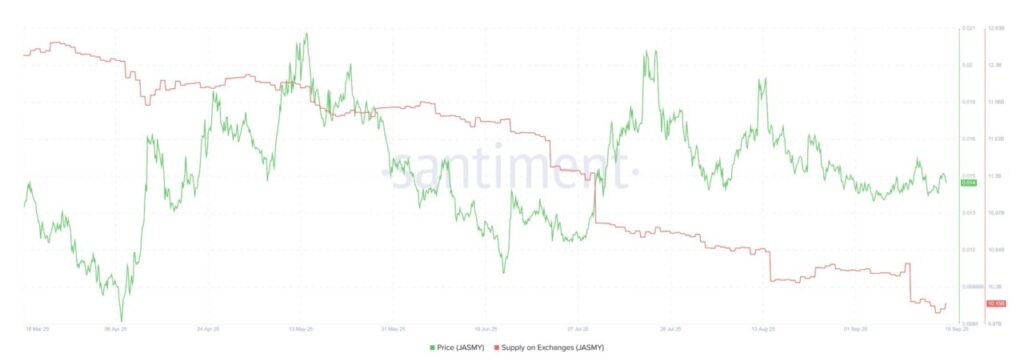 Santiment juga mencatat bahwa cadangan JASMY di bursa mencapai titik terendah dalam setahun, yakni 10,1 miliar pada bulan September. Grafik menegaskan adanya tren penurunan cadangan yang konsisten selama satu tahun terakhir.