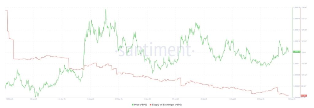 Pada bulan September, pasokan PEPE di bursa turun ke level terendah tahunan sebesar 93,8 triliun. Grafik juga menunjukkan cadangan bursa terus menurun sejak awal 2025.