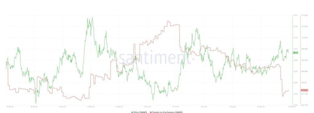 Sinyal bullish muncul pada bulan September ketika cadangan SAND di bursa turun mendekati level terendah tahunan. Hanya dalam kuartal ini, sekitar 850 juta SAND tercatat keluar dari bursa.