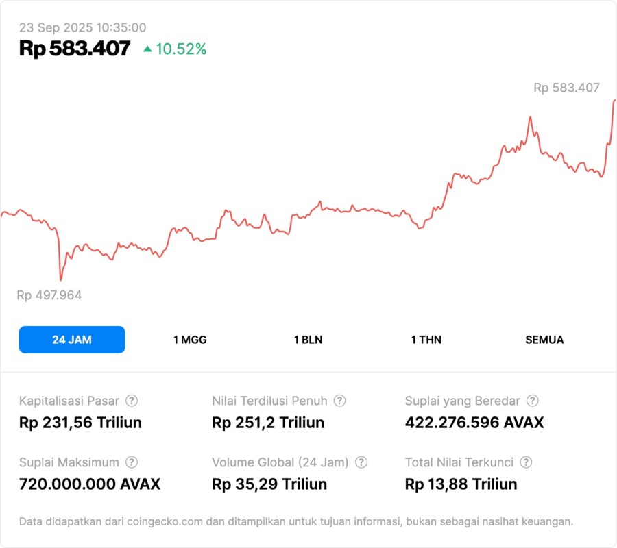 Menurut data dari CoinGecko yang dikutip oleh Pintu, harga Avalanche (AVAX) melonjak dari Rp497.964 menjadi Rp583.407 dalam kurun waktu 24 jam terakhir. Kenaikan ini setara dengan persentase 10,52%, menunjukkan tren positif yang cukup signifikan.