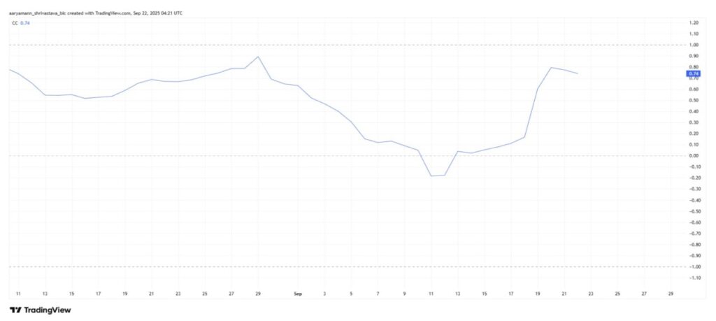 Korelasi antara Pi Coin dan Bitcoin saat ini berada di level 0,74, angka yang semakin menguat belakangan ini. Meski terkadang korelasi dapat mendorong pertumbuhan harga, kondisi ini justru menjadi tantangan bagi Pi Coin mengingat volatilitas Bitcoin yang tinggi serta kesulitannya mempertahankan tren naik.