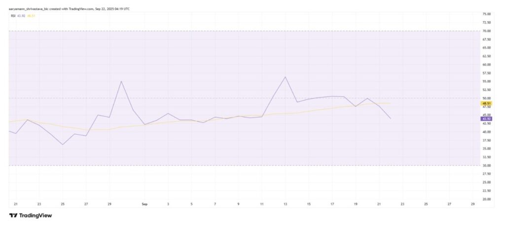 Dari sisi teknikal, momentum Pi Coin terus melemah. Indikator relative strength index (RSI) turun di bawah level netral 50,0, masuk ke zona bearish. Penurunan ini menunjukkan meningkatnya tekanan jual, sehingga peluang pemulihan Pi Coin semakin terbatas kecuali ada dukungan dari kondisi pasar yang lebih positif.