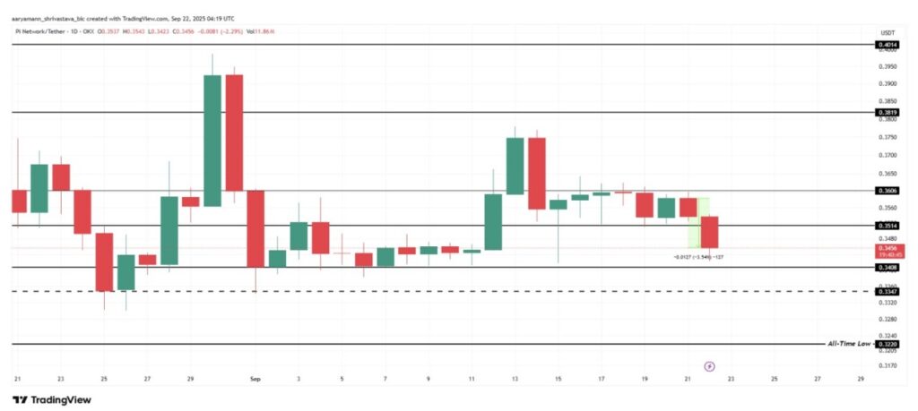 Per 22 September, Pi Coin sempat diperdagangkan di level $0,345, hanya sedikit di atas area support $0,340. Altcoin ini turun 3,5% setelah kembali ditolak di level resistensi $0,360, yang selama berminggu-minggu telah membatasi setiap upaya pemulihan.