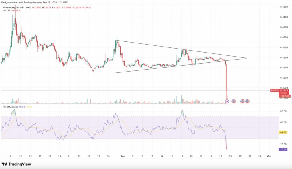 Pada grafik 4 jam (22/9), PI sebelumnya bergerak dalam pola segitiga simetris sejak 30 Agustus hingga pekan lalu. Namun, pola tersebut kini telah jebol ke bawah, menegaskan momentum bearish.