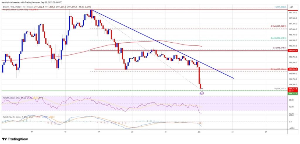 Penurunan ini cukup tajam, melampaui level $115.000, dengan titik terendah tercatat di $114.237. Saat ini, Bitcoin (BTC) sedang konsolidasi kerugian di bawah level retracement Fibonacci 23,6% dari penurunan terakhir.