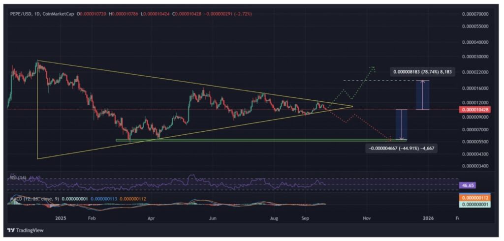 Sebuah grafik yang dibagikan oleh Martinez menunjukkan bahwa PEPE sedang terkonsolidasi dalam pola segitiga menurun, di mana harga membentuk titik tertinggi yang makin rendah dan titik terendah yang makin tinggi, sehingga pergerakan harga terjepit dalam rentang yang semakin sempit.