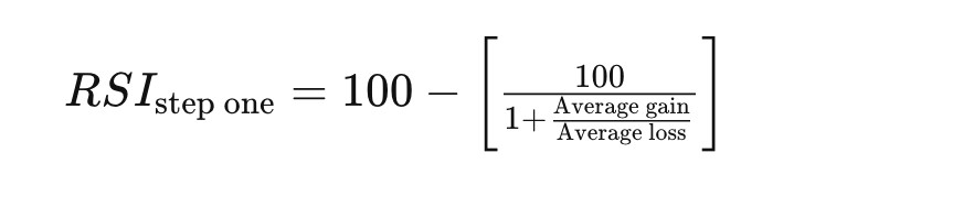 Formula dasarnya adalah: RSI=100−1001+AverageGainAverageLossRSI = 100 – \frac{100}{1 + \frac{Average Gain}{Average Loss}}RSI=100−1+AverageLossAverageGain​100​