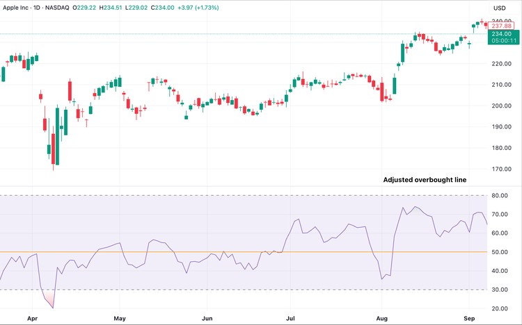 Contoh: jika rata-rata gain 1% dan loss 0,8% selama 14 hari, RSI awal akan bernilai sekitar 55,55.