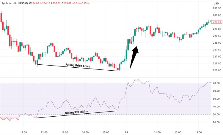 Divergensi terjadi ketika pergerakan harga dan RSI tidak searah: