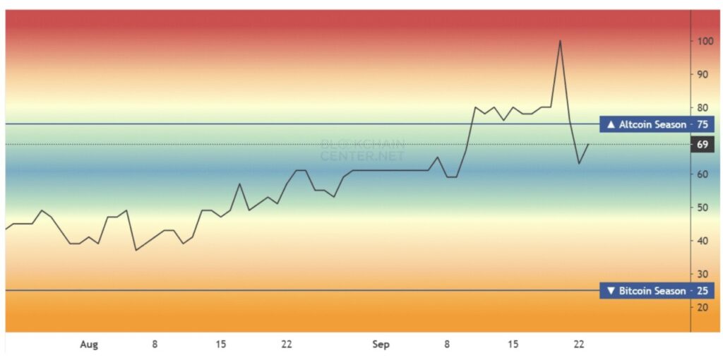 Namun, reli tersebut tidak bertahan lama. Per 24 September, indeks telah turun kembali ke 69 — hanya 10% di atas level pembukaan bulan September. Kesimpulannya, ini bukan lagi “Altcoin Season”, melainkan arus modal yang lebih bersifat spekulatif.