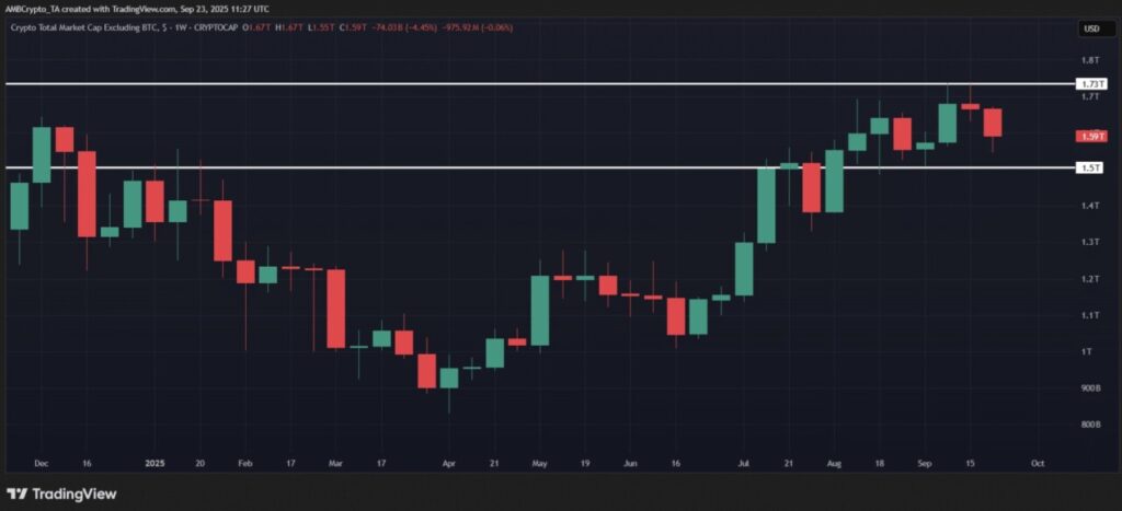 Sebagai gambaran, sejak puncaknya di pertengahan Agustus di 15%, ETH.D terus berada dalam tren menurun, sementara TOTAL2 mentok di $1,73 triliun. Artinya, altcoin tidak lagi mendapat dorongan dari ETH seperti biasanya, sehingga modal tetap terkunci di tempat lain.