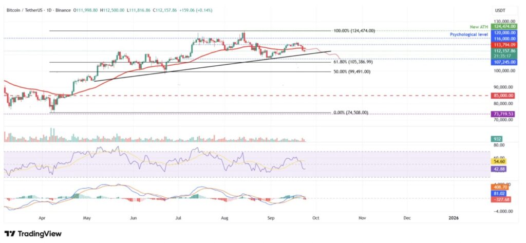 Harga Bitcoin gagal bertahan di level support harian $116.000 pada Jumat lalu dan turun 3,19% dalam empat hari berikutnya, hingga ditutup di bawah Exponential Moving Average (EMA) 50-hari di $113.794. Pada Rabu (24/9), BTC bergerak di sekitar $112.157.