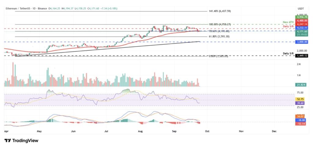 Harga Ethereum ditutup di bawah level support harian $4.488 pada Jumat lalu dan turun 6,77% dalam empat hari berikutnya, hingga akhirnya kembali ditutup di bawah support harian berikutnya di $4.232 pada Selasa. Saat penulisan Rabu, ETH berada di kisaran $4.171.