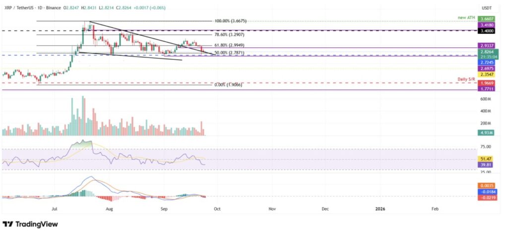 Ripple (XRP) gagal bertahan di sekitar level Fibonacci retracement 61,8% di $2,99 pada Jumat lalu dan turun 6,62% hingga Selasa (23/9). Saat hari Rabu (24/9), XRP bergerak di kisaran $2,82.