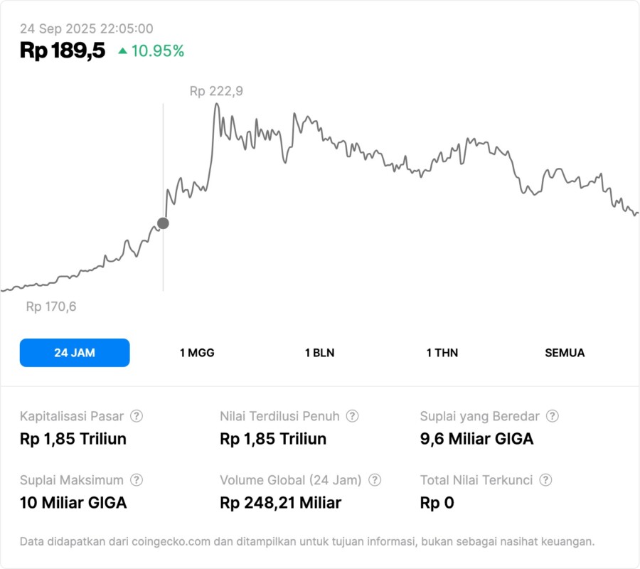 Dalam 24 jam terakhir, harga GIGA melonjak dari level Rp170,6 hingga mencapai puncaknya di Rp222,9 sebelum akhirnya terkoreksi ke Rp189,5. Ini menunjukkan volatilitas tinggi, namun tetap memberikan keuntungan bagi trader harian.
