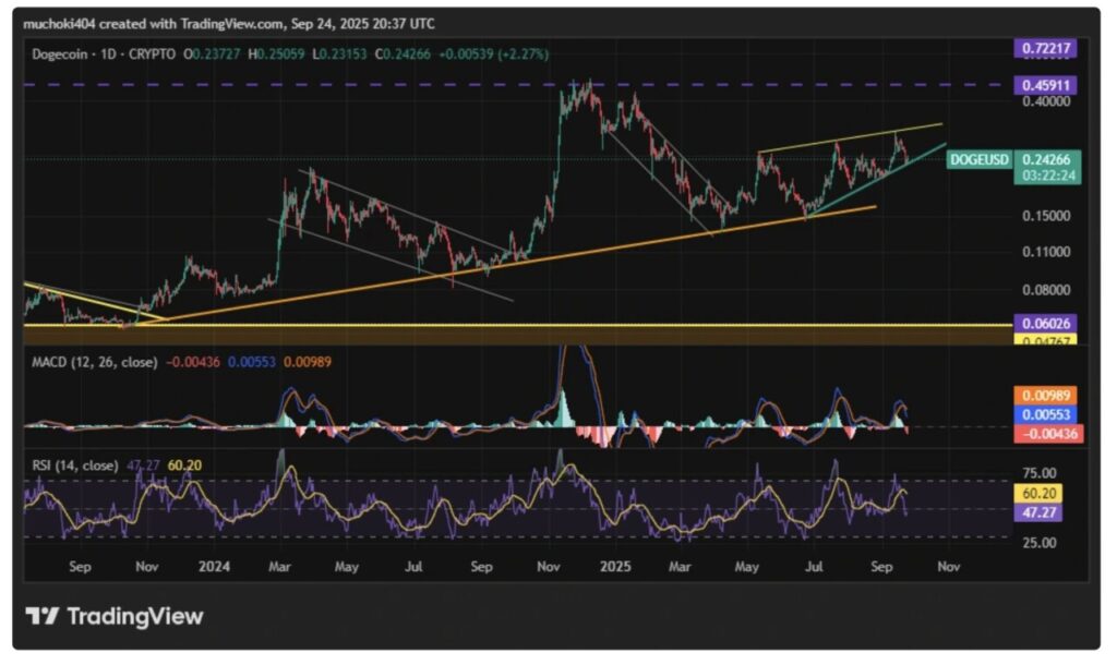 Jakarta, Pintu Market – Harga Dogecoin kemungkinan telah menyentuh titik terendah dari fase koreksinya. Meme coin terpopuler dengan kapitalisasi pasar sekitar $36,8 miliar ini mengalami kenaikan 2% pada 25 September, sempat mencapai puncak harian di kisaran $0,2497 sebelum kembali turun dan diperdagangkan di sekitar $0,2429.