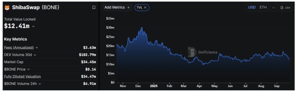 ShibaSwap, bursa terdesentralisasi milik SHIB, masih memproses volume transaksi jutaan dolar setiap bulan. Saat ini, TVL berada di sekitar $13,4 juta, ditambah dengan likuiditas $1,14 juta dari Shibarium.