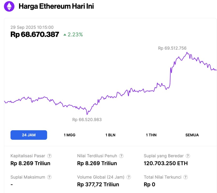 Saat penulisan, kapitalisasi pasar Ethereum kini berada di sekitar Rp8.269 triliun, dengan volume perdagangan harian yang naik 30% menjadi Rp377,72 triliun dalam waktu 24 jam terakhir.
