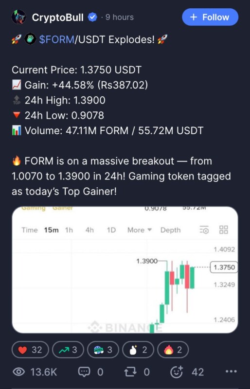 Volume ini juga menjadi sinyal kuat bahwa pasar tengah aktif, dengan aktivitas jual beli mencapai 47,11 juta FORM, menurut akun verified @CryptoBull di CoinMarketCap. Lonjakan volume biasanya menjadi indikator potensi breakout dalam pasar crypto.