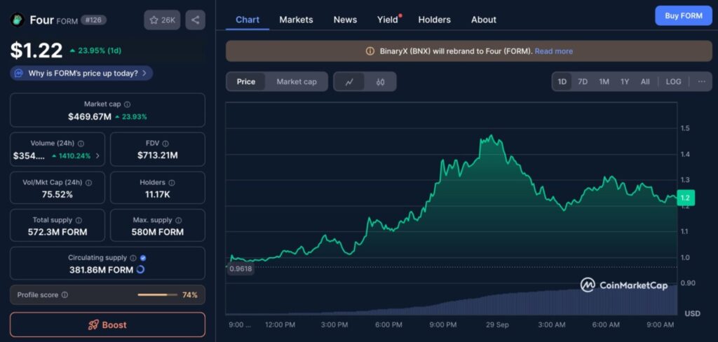 FORM bukan token baru sepenuhnya — ia merupakan hasil rebranding dari BinaryX seperti dikonfirmasi di halaman utama CoinMarketCap. Hal ini menjelaskan lonjakan minat pasar karena banyak investor lama BNX mulai mengalihkan perhatian ke FORM.