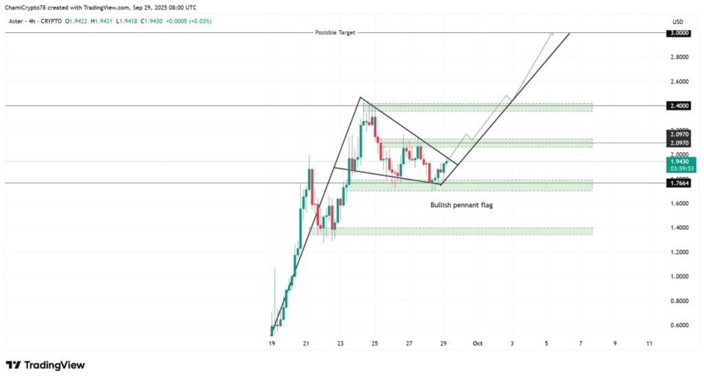 Pola bendera bullish pennant yang terbentuk setelah kenaikan tajam dari level di bawah $1,00 menunjukkan bahwa Aster mungkin akan terus naik. Token ini berhasil menembus ke atas sebelum kembali ke zona dukungan $1,76, yang masih terjaga dengan kuat. Konsolidasi dalam rentang yang semakin sempit menunjukkan bahwa pembeli masih mendominasi pasar meskipun ada tekanan untuk mengambil keuntungan.