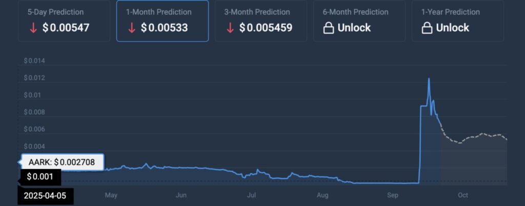 Dalam jangka pendek, prediksi harga Aark Digital menunjukkan fluktuasi yang signifikan. Pada Oktober 2025, harga AARK diperkirakan akan menurun sebesar -25,08%, mencapai $0,006943. Namun, dalam jangka menengah, khususnya tahun 2026, AARK diperkirakan akan berdagang dalam kisaran harga yang lebih luas dari $0,006367 hingga $0,025397. Ini menunjukkan adanya peluang pertumbuhan yang signifikan, dengan potensi kenaikan harga hingga 174,07% pada bulan Juli 2026.