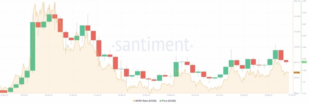 Dari sisi on-chain, rasio Market Value to Realized Value (MVRV) Dogecoin saat ini turun ke level 57,70%. Secara historis, harga DOGE biasanya mencapai puncak siklus ketika rasio MVRV berada di kisaran 250% hingga 519%.
