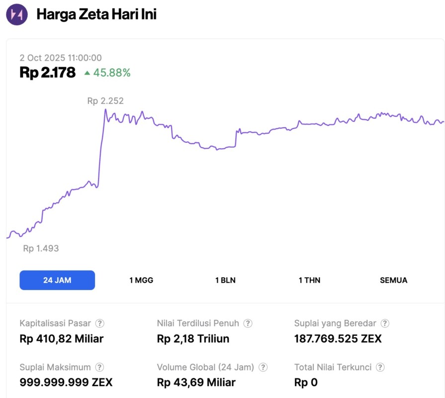 Pada 2 Oktober, harga Zeta tercatat di level Rp2.178, melonjak +45,88% dalam 24 jam terakhir. Lonjakan ini membawa ZEX menduduki posisi peringkat 1 sebagai crypto dengan kenaikan tertinggi hari ini di Pintu Market.