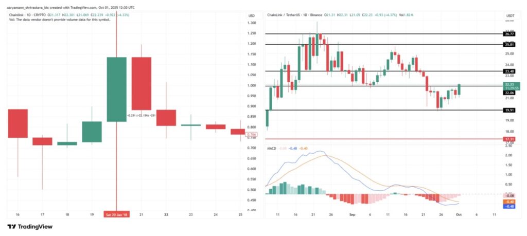 Pada penutupan pemerintahan AS di tahun 2018, LINK sempat merosot hingga 22%. Namun, situasi saat ini berbeda. Indikator MACD menunjukkan potensi terjadinya bullish crossover, yang menandakan momentum penguatan.