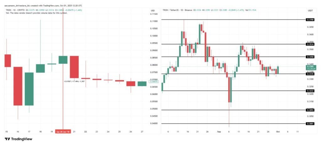 Tujuh tahun lalu, Tron belum masuk ke dalam jajaran 10 besar aset crypto, meskipun saat itu sudah memiliki kapitalisasi pasar sebesar $4,6 miliar. Pada penutupan pemerintahan AS sebelumnya, TRX justru menjadi salah satu koin dengan penurunan paling tajam, anjlok hingga 17% hanya dalam 24 jam akibat sentimen pasar yang berubah negatif.