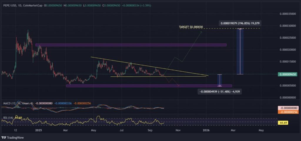 Dilansir dari CoinSpeaker (1/10/25), grafik harga Pepe (PEP)E menunjukkan pola konsolidasi dalam formasi descending triangle, sebuah pola teknikal yang umumnya menguntungkan pihak bearish. Harga terus tertekan menuju area puncak formasi, dengan serangkaian lower high terbentuk melawan zona support yang relatif stabil.