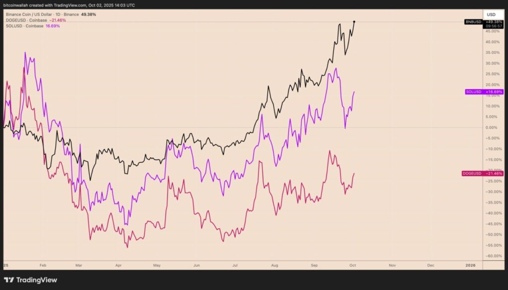 Jakarta, Pintu News ā Bulan Oktober sering dijuluki āUptoberā di komunitas crypto karena secara historis banyak aset digital, termasuk altcoin, mencatatkan kinerja positif. Pada tahun 2025, minat investor kembali terfokus pada tiga aset utama di luar Bitcoin (BTC): BNB, Solana , dan Dogecoin .