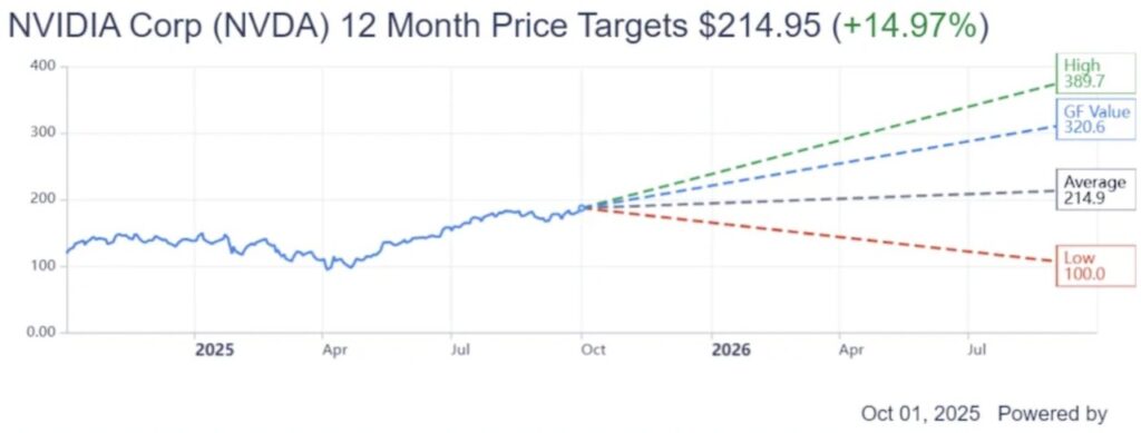 Rata-rata target ini mengindikasikan potensi kenaikan sebesar +14,97% dari harga saat ini yaitu $186,96. Sementara itu, menurut estimasi dari GuruFocus, nilai wajar (GF Value) NVIDIA dalam satu tahun diperkirakan mencapai $320,57, yang menunjukkan potensi kenaikan sebesar +71,46% dari harga saat ini.