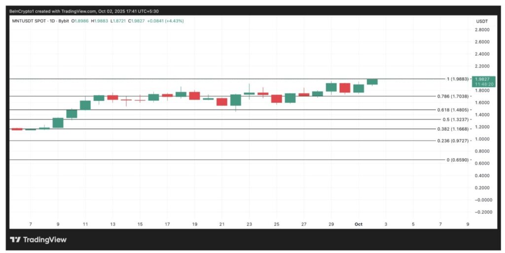 Per 2 Oktober, MNT diperdagangkan di kisaran harga tertingginya yang baru, yaitu $1,98. Jika permintaan terus meningkat, harga MNT berpotensi naik lebih tinggi lagi.