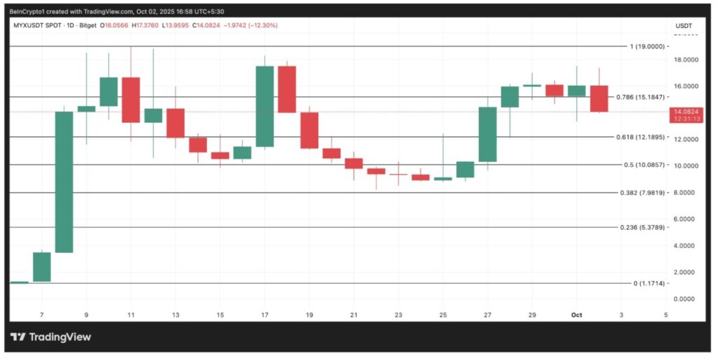 Dalam sepekan terakhir, MYX naik 57% dan saat ini menghadapi level resistance di $15,84. Jika aktivitas perdagangan tetap tinggi dan token ini berhasil mengubah resistance tersebut menjadi level support, harga MYX berpotensi naik kembali dan menyentuh rekor tertingginya di $19.