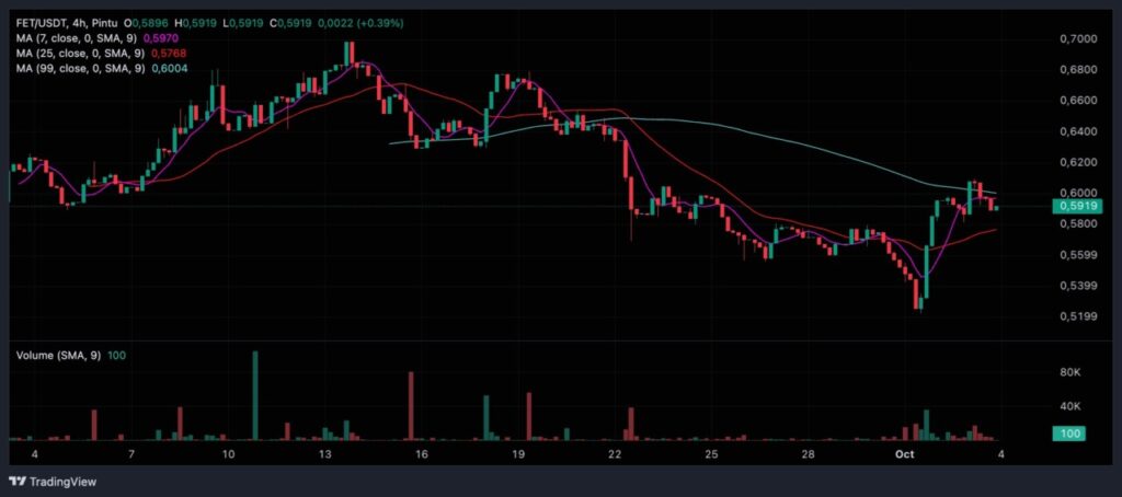 Berdasarkan data di atas, Harga FET menunjukkan tanda-tanda pemulihan setelah koreksi tajam yang sempat menekan harga hingga ke level terendah sekitar $0,52. Saat berita ini ditulis (3/10/25), FET diperdagangkan di kisaran $0,5919, naik tipis 0,39% dalam 24 jam terakhir.