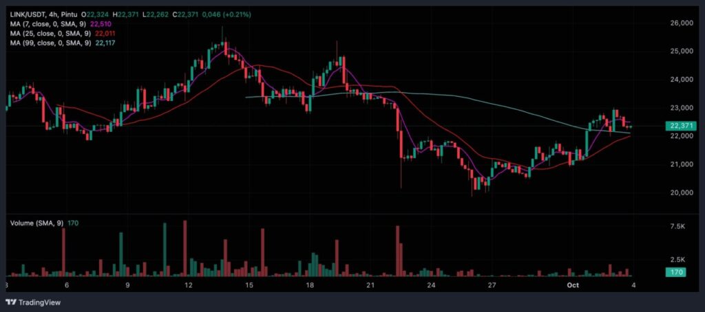 Per 3 Oktober, Chainlink diperdagangkan di $22,371, naik 0,21% dalam 24 jam terakhir. Setelah turun ke area $21,000, LINK berhasil rebound dan kembali ke atas $22,000. Secara teknikal, MA 25 ($22,011) dan MA 99 ($22,117) membentuk support kuat di area $22, sementara MA 7 ($22,510) menjadi resistance jangka pendek.