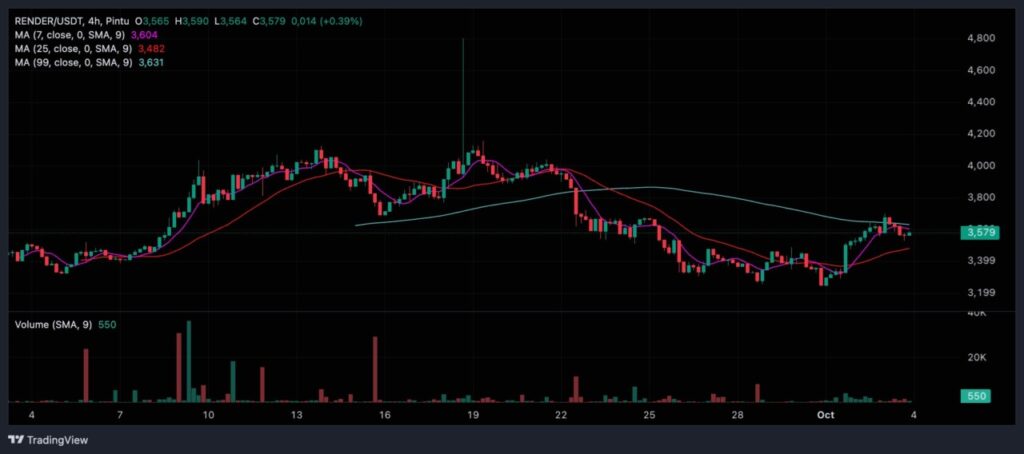 Per 3 Oktober, harga RENDER diperdagangkan di sekitar $3,579, naik tipis 0,39% dalam 24 jam terakhir. Setelah sempat turun hingga $3,20, RNDR berhasil rebound dan kini menguji level psikologis $3,60.